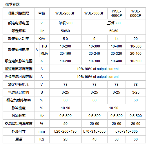 2.具有直流氩弧/交流氩弧/脉冲氩弧/交直流混合氩弧/手工弧焊多种功能,氩弧焊有二步、四步、反复、点焊等功能,起弧电流、收弧电流、衰减时间、脉冲控制、脉冲电流、脉冲宽度、脉冲频率分别单独可调,另外能选用遥控装置调节电流;3.适用于焊接不锈钢、碳钢、合金钢、铜、钛、铝及铝合金等各种金属材料;4.可使用酸性、碱性及纤维素(向下)等各种类型的焊条;5.广泛应用于金属制造、工程安装、造船、化工机械、维修等行业。产品技术参数